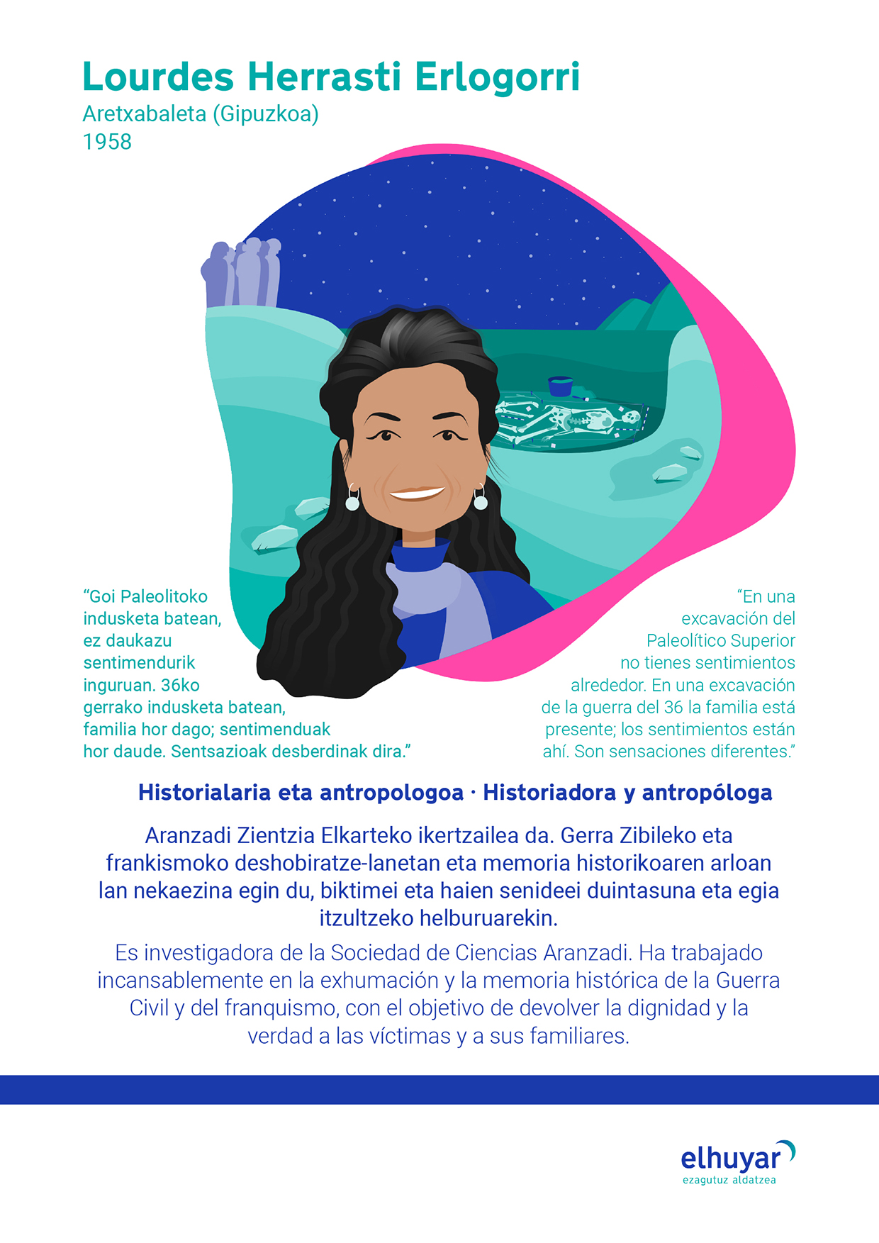 Lourdes Herrasti Erlogorri es referente en la recuperación de la memoria histórica y en la investigación antropológica. Nacida en Aretxabaleta, desde muy joven estuvo muy interesada por la historia, y aunque se planteó estudiar periodismo para ser reportera, acabó estudiando Geografía e Historia. Se especializó en osteoarqueología, una disciplina que estudia los huesos de las excavaciones arqueológicas.