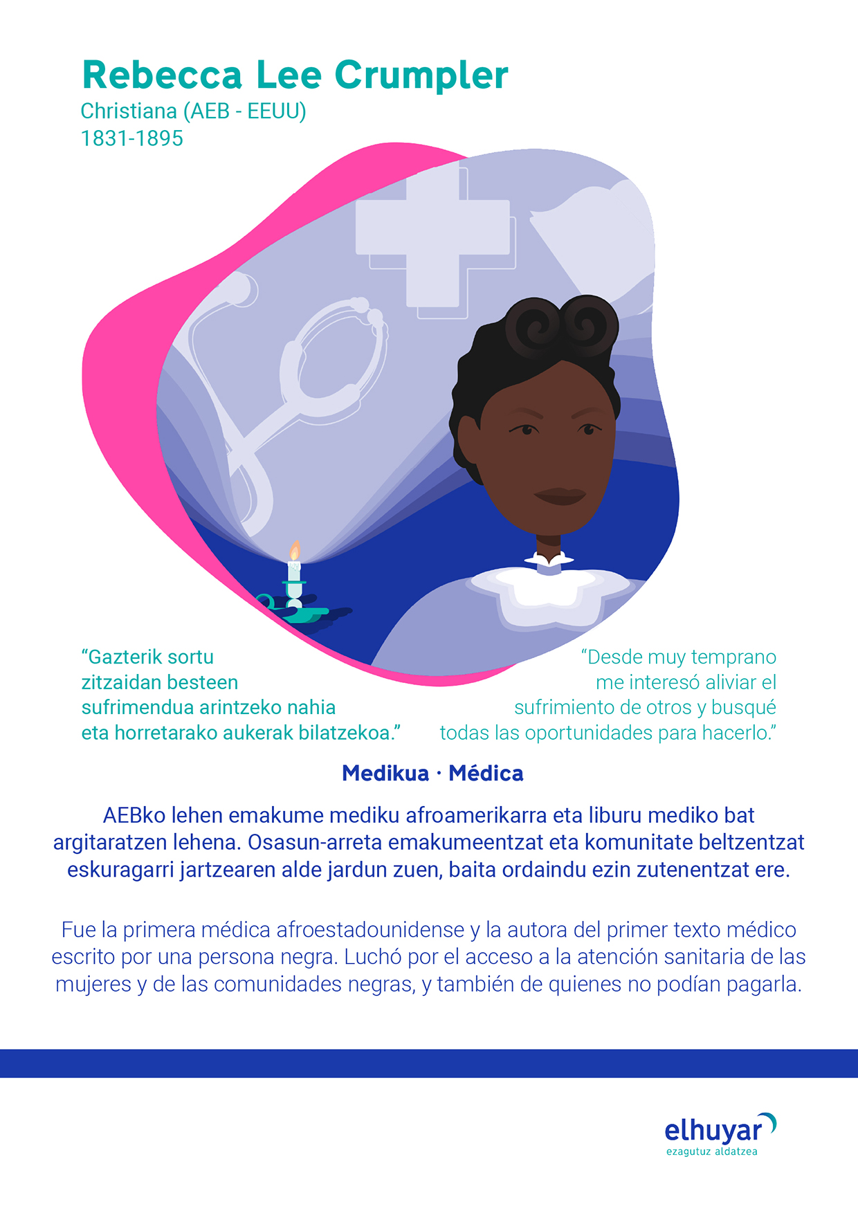 Rebecca Lee Crumpler fue la primera mujer médica afroamericana de los Estados Unidos. Nacida en Delaware, creció con una tía que vivía en Pensilvania. Su tía fue una mujer inspiradora para Rebecca, porque cuidaba y curaba a sus vecinos y vecinas cuando enfermaban.