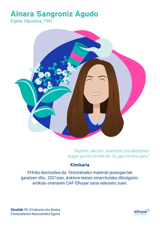 2020an aurkeztutako doktoretza-tesian, ontziratzerako erabiltzen diren material polimeriko jasangarriak garatu zituen, hala nola, polimero biodegradagarri eta kimikoki birziklagarriak. Ikerlan horretatik abiatuta, doktore-tesian oinarritutako dibulgazio-artikulu onenaren CAF-Elhuyar saria irabazi zuen 2021ean, artikulu honekin: Polimero jasangarriak garatzea elikagaiak ontziratzeko.