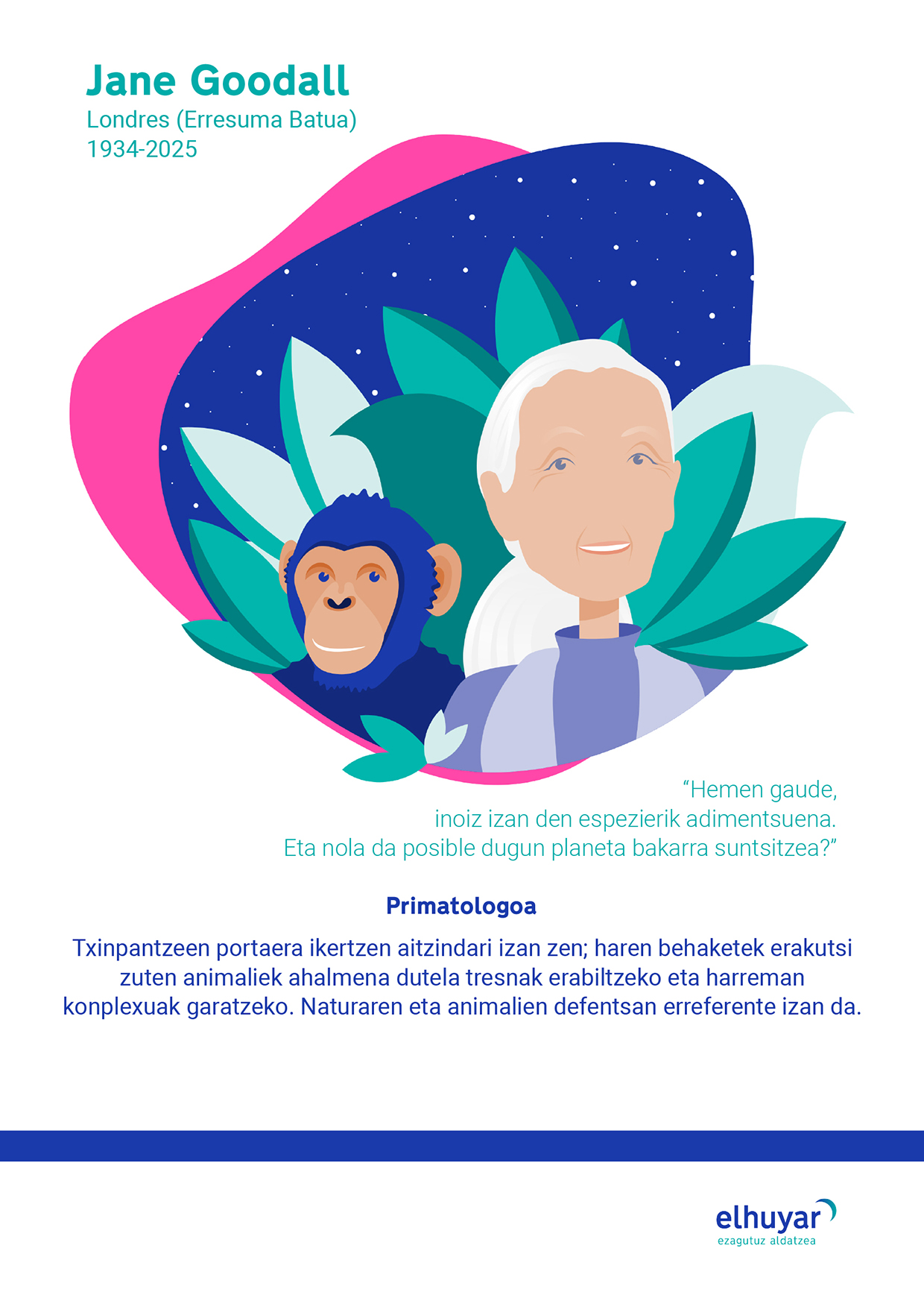 Jane Goodall 91 urte zituela hil zen 2025ean, garaiko primatologo, etologo eta antropologo garrantzitsuenetako bat izanik. Gaur egun, bere pelutxezko txinpantzeak Londresko bere etxeko aulki batean eserita jarraitzen du, haurtzaroko amets eta pasioa gogoraraziz.